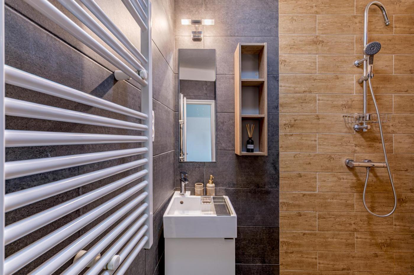 One-Bedroom Apartment. Featuring a private entrance, this air-conditioned apartment comprises 1 bedroom and 1 bathroom with a bath or a shower. Guests can make meals in the kitchen that is equipped with a stovetop, a refrigerator, a dishwasher and kitchenware. The apartment provides a washing machine, a tea and coffee maker, a sofa, parquet floors and a flat-screen TV. The unit offers 1 bed.
