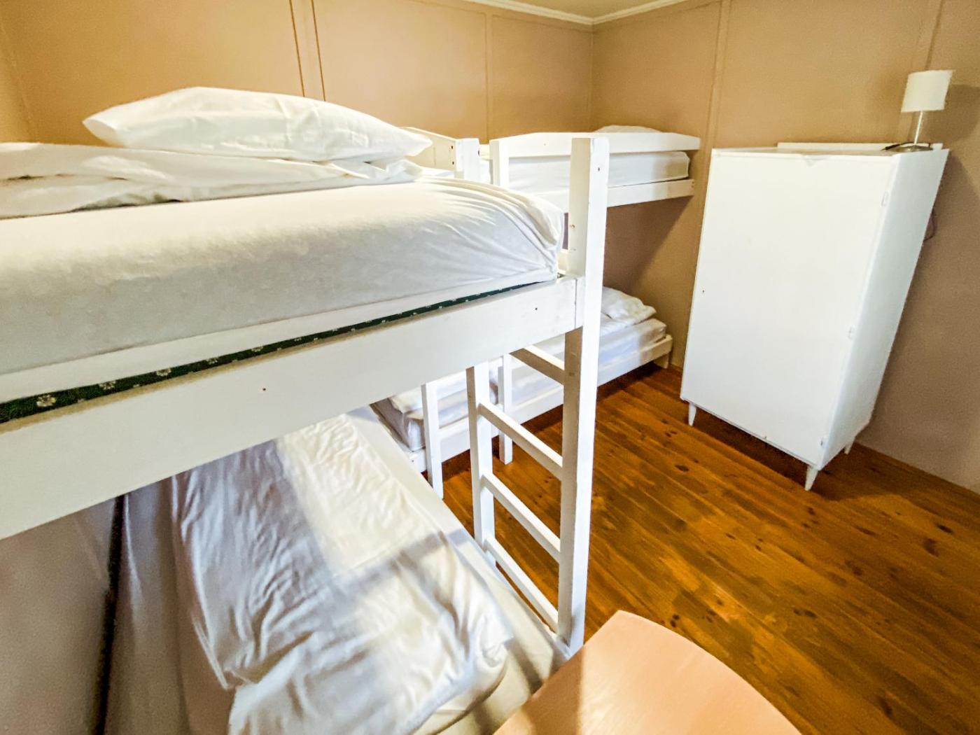 The shared bathroom is fitted with a shower. At the campground, units are fitted with bed linen and towels.